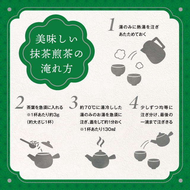上品な香りとこくのある煎茶に厳選された抹茶をブレンド。とろりとしたまろやかな旨味と甘み、美しい水色をお楽しみください。